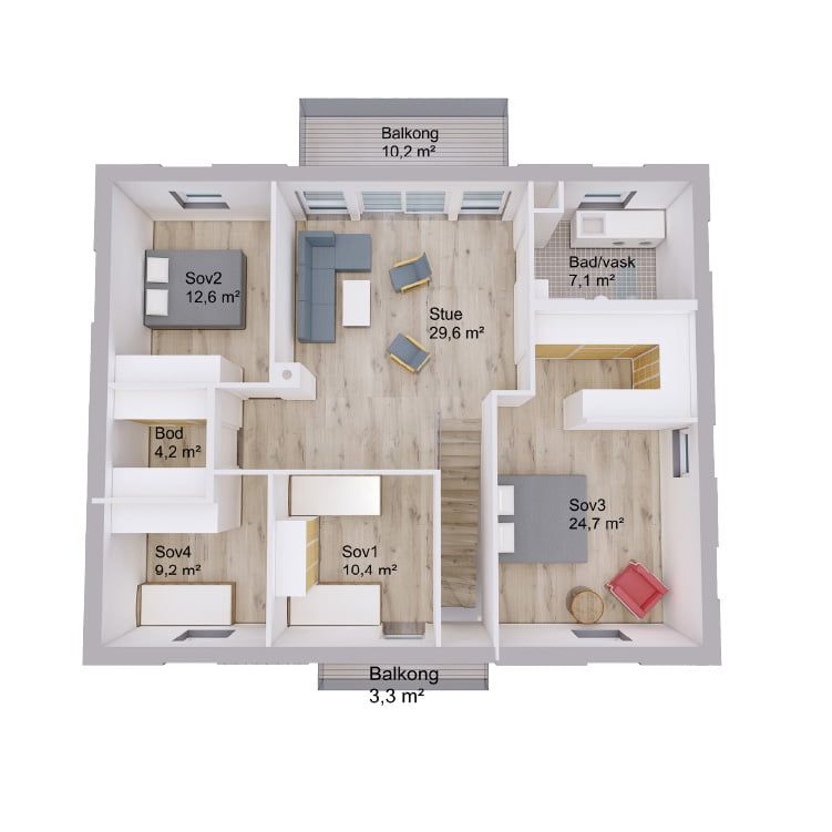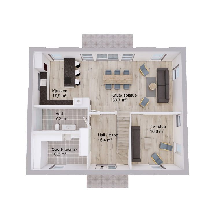 Boligen har 4 soverom på samme plan, hvor hovedsoverommet er utstyrt med en walk-in garderobe for enkel organisering. Dette gir en følelse av orden og luksus i hverdagen. En adskilt TV-stue gir muligheten for ro og avslapning, samtidig som den kan åpnes til en større vinkelstue for å skape et mer sosialt område. Med stramme linjer og vakre detaljer, skaper denne boligen et inntrykk av både styrke og estetikk.