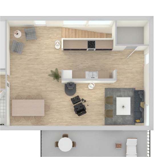 Kjøkkenet er sentrert midt i rommet og fungerer som en sosial sone som binder sammen stue og oppholdsrom. Denne utformingen gir et naturlig samlingspunkt for familie og venner, og skaper et rom hvor alle kan samles til måltider eller sosiale anledninger. Kjøkkenets design gjør det enkelt å tilpasse oppsettet etter behov, og gir et fleksibelt og funksjonelt samlingssted.