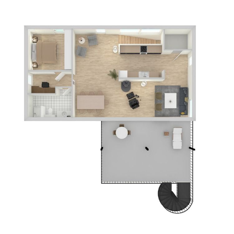 Kjøkkenet er sentrert midt i rommet og fungerer som en sosial sone som binder sammen stue og oppholdsrom. Denne utformingen gir et naturlig samlingspunkt for familie og venner, og skaper et rom hvor alle kan samles til måltider eller sosiale anledninger. Kjøkkenets design gjør det enkelt å tilpasse oppsettet etter behov, og gir et fleksibelt og funksjonelt samlingssted.