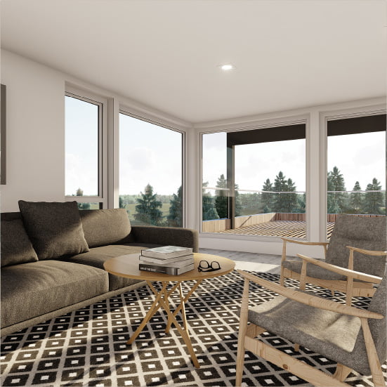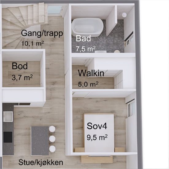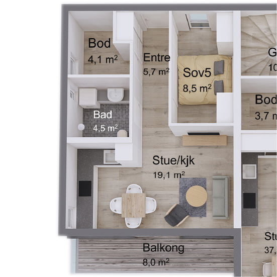 Den stilige loftstuen gir et ekstra oppholdsrom for familien, der du kan nyte utsikten fra de store vinduene eller slappe av med en god bok. Kombinasjonen av det store uteområdet på takterrassen og loftstuen gjør Lahell til et hjem med fleksible rom for både underholdning og privatliv. Den adskilte utleiedelen over garasjen er en smart løsning som gir ekstra inntekt eller et ekstra rom for gjester.