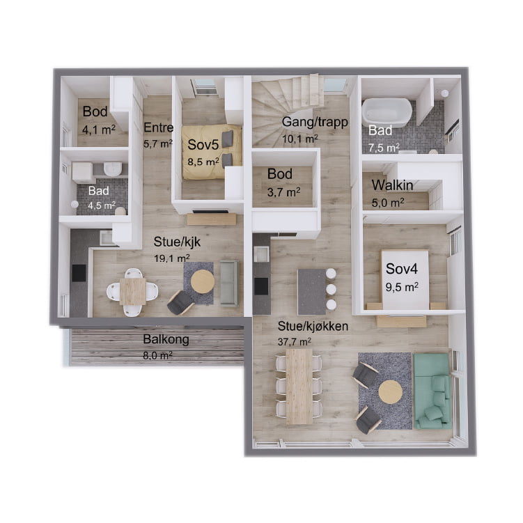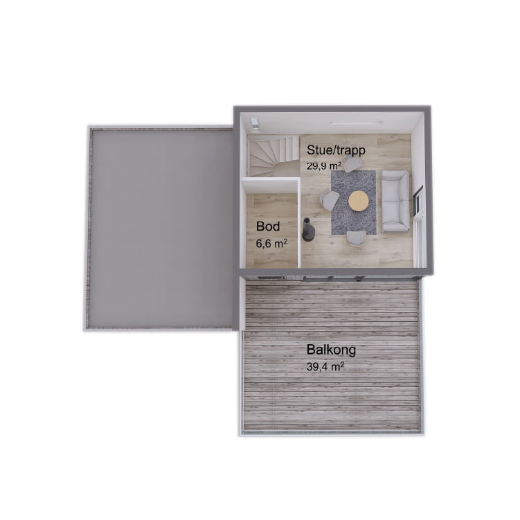 Den stilige loftstuen gir et ekstra oppholdsrom for familien, der du kan nyte utsikten fra de store vinduene eller slappe av med en god bok. Kombinasjonen av det store uteområdet på takterrassen og loftstuen gjør Lahell til et hjem med fleksible rom for både underholdning og privatliv. Den adskilte utleiedelen over garasjen er en smart løsning som gir ekstra inntekt eller et ekstra rom for gjester.