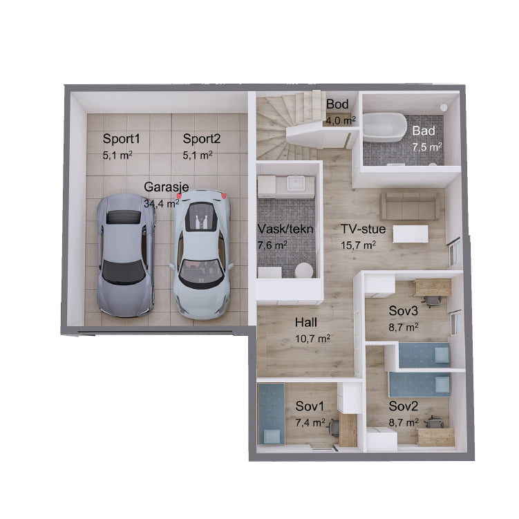Lahell har en separat utleiedel over den integrerte garasjen, noe som gir en smart utnyttelse av tomten. Dette gir muligheten til å generere ekstra inntekt eller ha et eget rom for gjester. Utleiedelen er adskilt fra hovedboligen, noe som gir leietakerne privatliv, samtidig som det gir en fleksibel løsning for huseieren.
