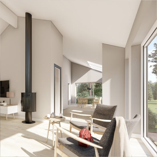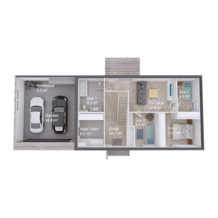 Husmodellen Tverråsen utstråler moderne eleganse med sitt unike design. Store vindusflater og rene linjer gir naturlig lys, mens skrå himling i stue og kjøkken skaper en luftig atmosfære. Den delvis overbygde terrassen over garasjen gir ly fra vær og vind, noe som gjør den til en hyggelig uteplass året rundt. Direkte adkomst fra garasjen til boligen sørger for praktisk og tørr tilgang.