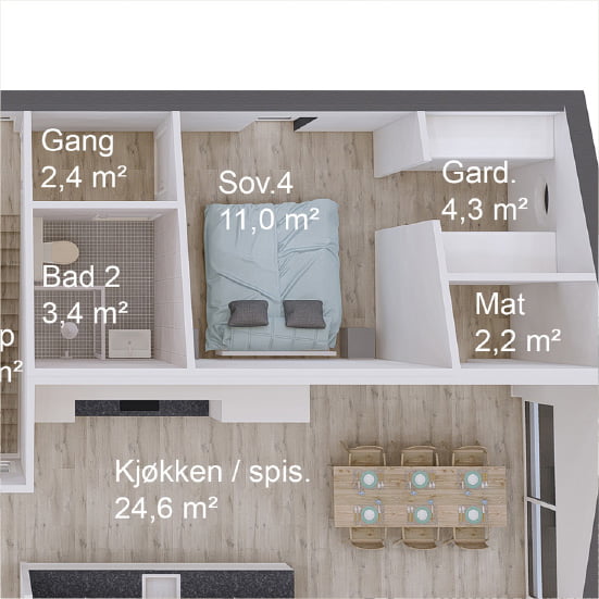 Mastersoverommet har eget bad og garderobe, som skaper en privat og komfortabel sone. Denne praktiske løsningen gjør det enkelt å starte dagen med god organisering og privatliv. Tverråsen passer perfekt for deg som ønsker en moderne bolig med smarte, praktiske løsninger og en gjennomtenkt rominndeling.