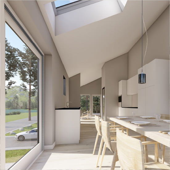 Med rene linjer, store vindusflater og takvinduer, fremhever Tverråsen en moderne og minimalistisk stil. Skrå himling i stue og kjøkken gir en følelse av romslighet og skaper et lyst og innbydende miljø. Denne unike kombinasjonen av designelementer gjør Tverråsen til et elegant og stilrent hjem for de som søker moderne boligdrømmer.